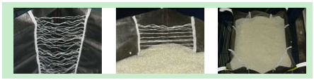 These specially designed net baffles, enables even the least flowing products to flow directly to the corners of the formed bag. Different than the conventional formed bag baffle design with holes, the horizontally knitted yarns provide extra sift proof and load securement during stacking.